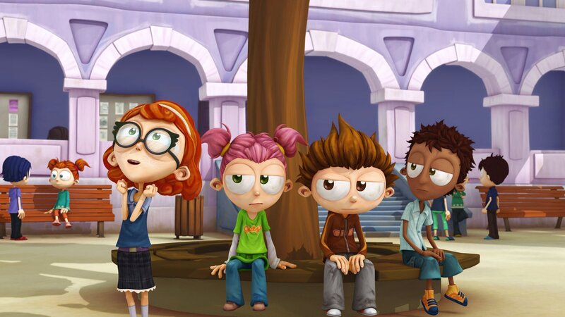 • Becky (l.) tritt gegen Angelo (2.v.r.) im Kampf um den Moderatorenjob an. Dabei hat sie große Pläne, wie sie dadurch die Schule verändern will.
