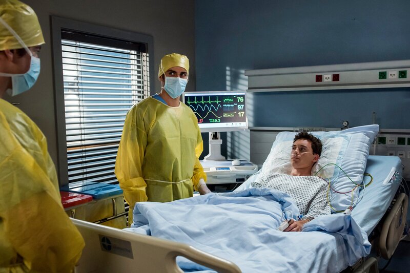 Seit seiner Einlieferung bekommt Jakub Antibiotika, weil er neben der leichten Kopfverletzung unter Fieber leidet. Doch die schlagen nicht an. Als die Ärzte herausfinden warum, müssen sie Jakub isolieren. Er hat multiresistente Keime. Hochansteckend! V.l.n.r. Ben Ahlbeck (Philipp Danne), Dr. Niklas Ahrend (Roy Peter Link), Jakub Renner (Jonas Hämmerle).