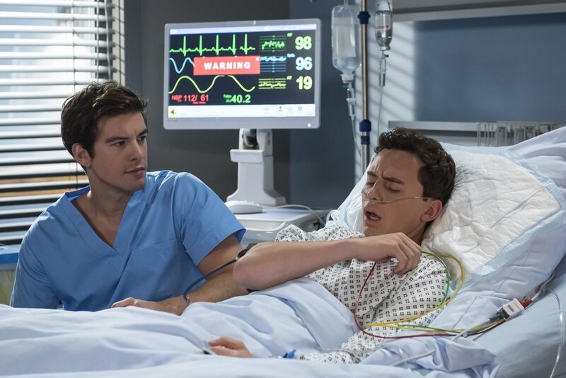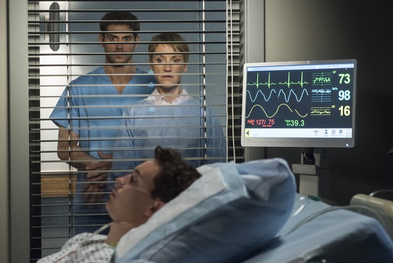 Jakub Renner hat zwar alle Untersuchungen und die weitere OP gut überstanden, aber wirklich über den Berg ist er erst, wenn er aufwacht. Gerade als Niklas das sagt, schlägt Jakub die Augen auf. V.l.n.r. Dr. Niklas Ahrend (Roy Peter Link), Jakub Renner (Jonas Hämmerle), Anja Renner (Theresa Berlage).