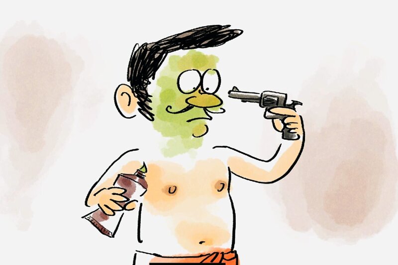 Als guter Wissenschaftler testete Percy die schusssichere Salbe mit einem Revolver an sich selbst.