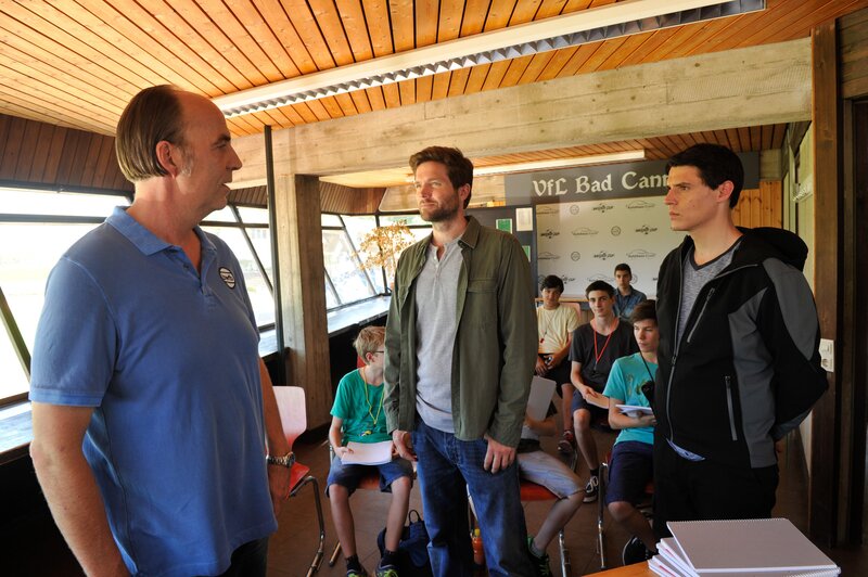 • Jo Stoll (Peter Ketnath, M.), und Rico Sander (Benjamin Strecker, r.) konfrontieren Jörg Koppert (Maximilian Wigger-Suttner) während einer Schulung vor seinen Schülern mit brisanten Informationen. Gespannt beobachten sie dessen Reaktion.