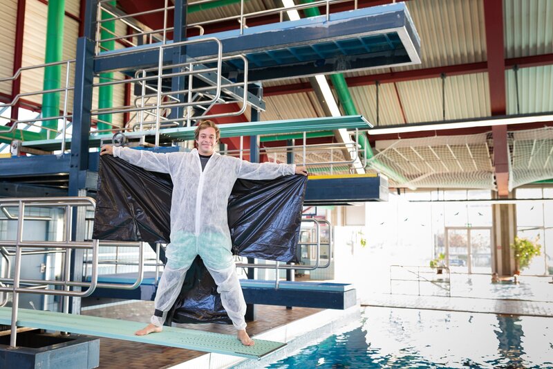 Als "Checker Tobi" stellt sich Tobias Krell der jeweils aktuellen Challenge mit ungezügelter Experimentierlaune und viel Checker-Humor. Seinen selbstgezimmerten CheXperimentier-Tisch hat er immer dabei und kann ihn überall aufbauen. Und ohne das Publikum vor Ort wäre er oft ziemlich aufgeschmissen. Heute hat Tobi einen furchtlosen Herausforderer. Matthias ist professioneller Stuntman und übernimmt in Filmen die Szenen, die für die Schauspieler zu gefährlich sind. Kein Wunder, dass er sich ein ziemlich waghalsiges CheXperiment ausgedacht hat. Tobi muss im Schwimmbad von einem fünf Meter Turm springen. Normalerweise dauert ein Sprung etwa eine Sekunde. Matthias will, dass Tobis Sprung, eineinhalb Sekunden dauert. Der Checker muss also die Physik austricksen und langsamer fallen. Aber wie? Tobi darf keine Geräte mit Motor verwenden. Vielleicht klappt es ja mit einer Art Fallschirm? Oder steckt nur ein Stunt-Trick dahinter?