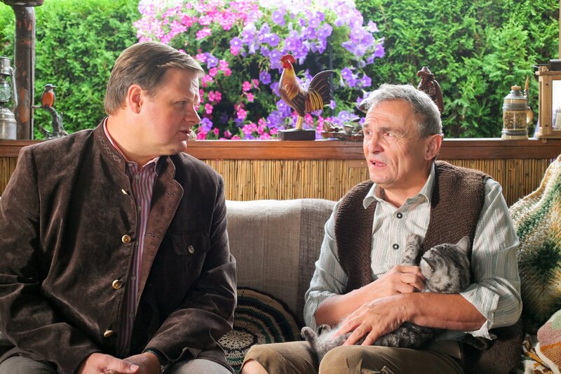 Kommissar Hartl (Michael A. Grimm, l.) glaubt, dass Mörtlbauer (Franz Froschauer, r.) seinen Garten-nachbarn im Streit erschlagen hat.
