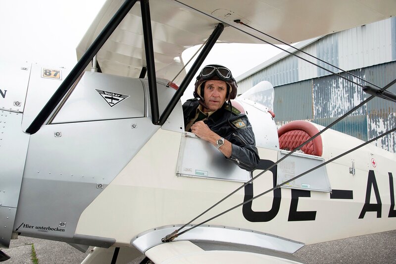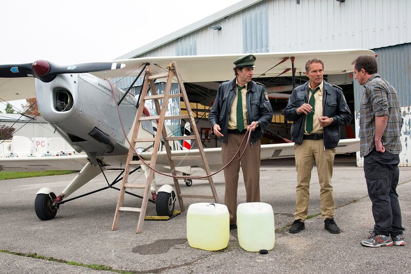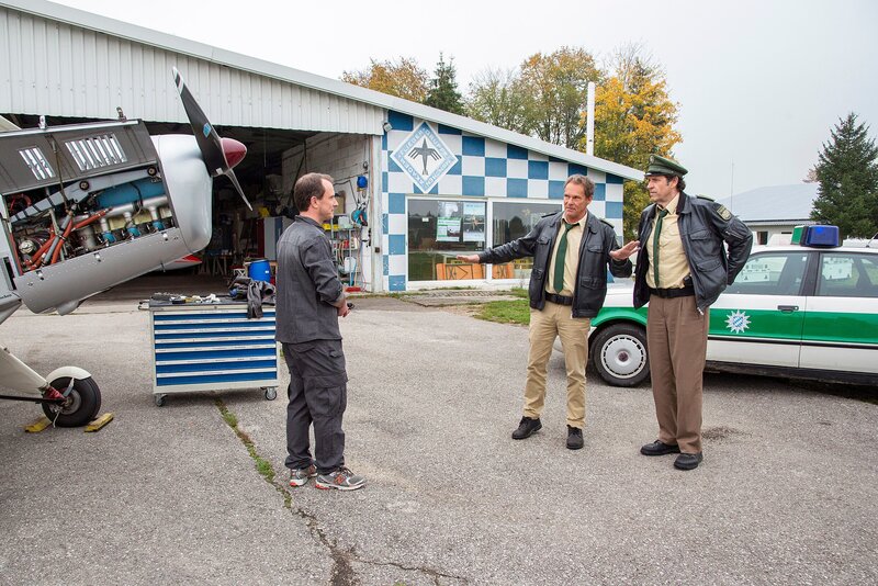 Zwecks Spurensuche wollen Hubert (Christian Tramitz, M.) und Staller (Helmfried von Lüttichau, r.) mit dem Flugschulleiter Michael Kronthaler (Christian Heiner Wolf, l.) einen Rundflug unternehmen.