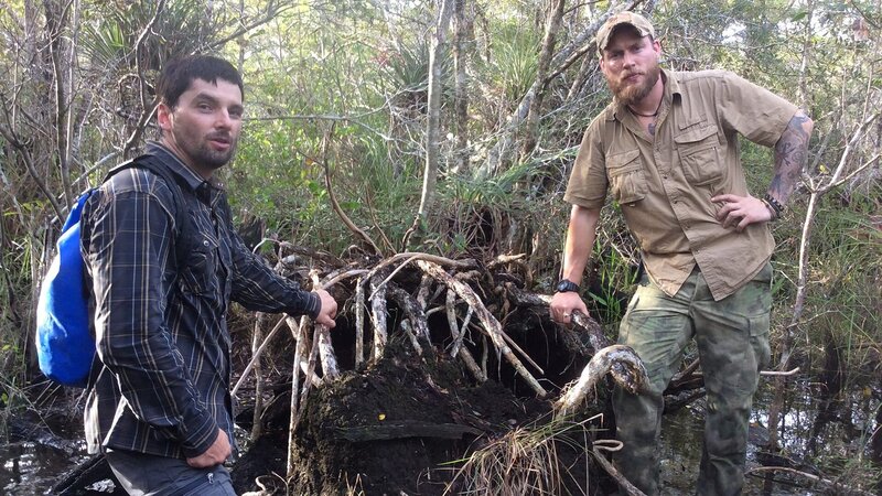 • Grady Powell and Bill McConnell next to an upturned tree in a swamp in Cuba.