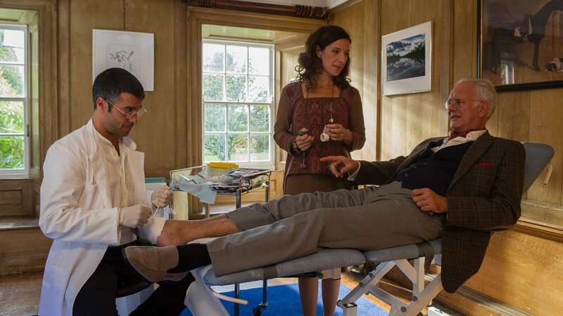 Der hypochondrische Lord Hurrleton (Harald Schmidt, r.) ist Dr. Rayans (Xaver Hutter, l.) bester Patient. Jasemin (Clelia Sarto, M.) assistiert dem Arzt.