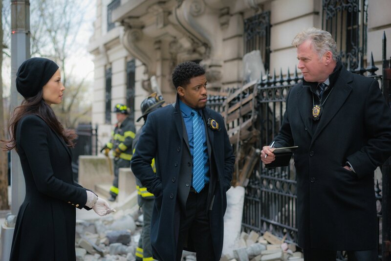 • In Morlands Büro geht eine Bombe hoch. Watson (Lucy Liu, l.) und Holmes halten Moriartys Organisation für den Drahtzieher. Doch sie beschließen, das lieber vor Captain Gregson (Aidan Quinn, r.) und Detective Bell (Jon Michael Hill, M.) geheim zu halten und ermitteln auf eigene Faust.