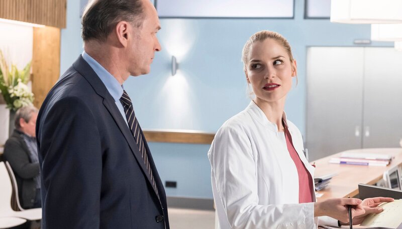 Dr. Marc Lindner (Christian Beermann, l.) kommt als Onkologe ins Klinikum, um einen Vortrag zu halten. Im Bereitschaftsraum bereitet er sich vor. Dr. Moreau (Mike Adler, r.) hält ihn für den neuen Hausmeister und lobt ihn für seine fleissige Arbeitshaltung.