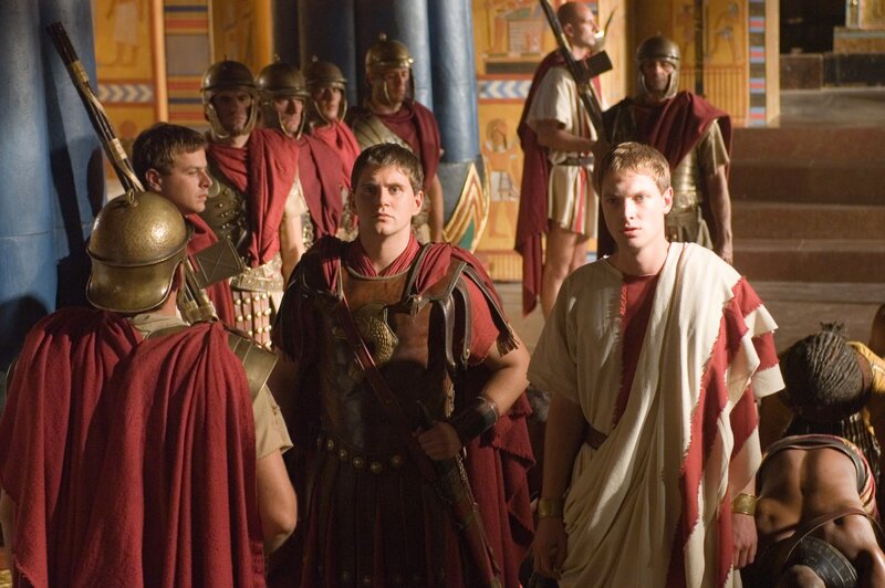 Entsetzt stehen Octavius (Simon Woods, re.) und Agrippa (Allen Leech, li.) vor Marc Antons Leichnam.