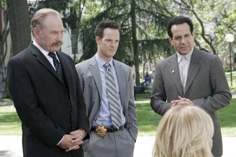 Bei Monks (Tony Shalhoub, re.) Jahrgangstreffen auf dem College tauchen auch Capt. Stottlemeyer (Ted Levine, l.) und Lt. Disher (Jason Gray-Stanford) auf, die einen Mord aufklären müssen, dessen Spuren offensichtlich zu den Teilnehmern des Klassentreffens führen.
