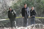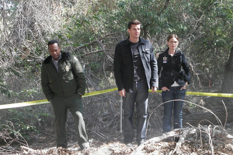 Booth (David Boreanaz, L) and Brennan (Emily Deschanel, R) find strange clues while investigating the murder of a student in the BONES episode "The Headless Witch in the Woods".