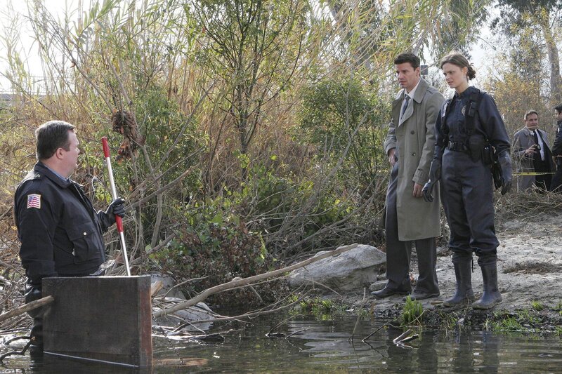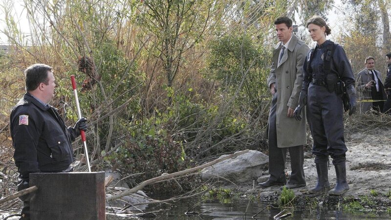 Booth (David Boreanaz, Mi) und Brennan (Emily Deschanel) untersuchen den Tatort, an dem eine Frau, ohne Knochen und in einer Kiste verpackt, im Fluss gefunden wurde.
