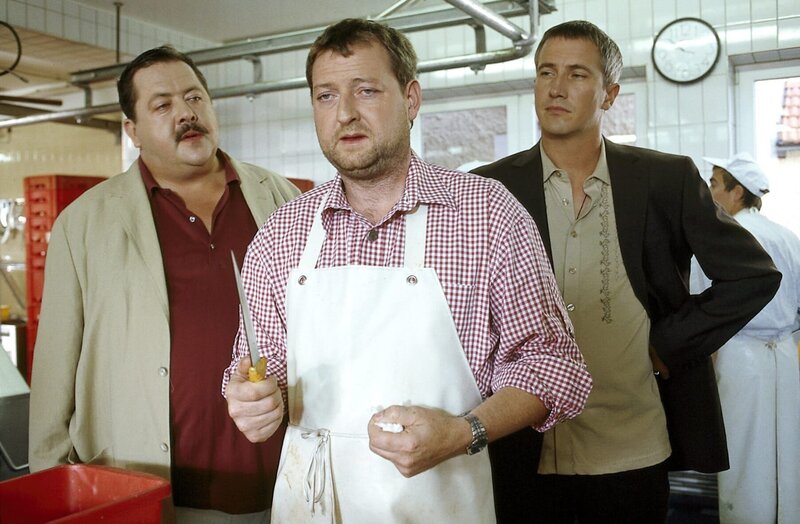 Die Kommissare Korbinian Hofer (Joseph Hannesschläger, li.) und Ulrich Satori (Markus Böker, re.) statten Metzger Feller (Maximilian Krückl) einen Überraschungsbesuch ab.