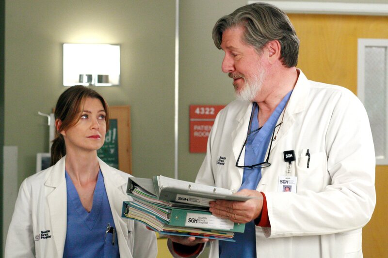 Da Meredith (Ellen Pompeo, l.) mit Alex einen Deal eingegangen ist, muss sie sich nun um dessen Assistenzarzt Norman (Edward Herrmann, r.) kümmern ...