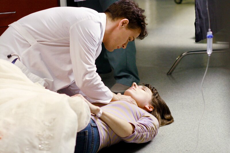 • Callie, George, Mark und Alex behandeln zwei junge Frauen namens Helena Boye und Jackie Escott, die sich bei einem Streit um ein Hochzeitskleid verletzt haben. George (T.R. Knight, l.) muss die gesamte Zeit über das Brautkleid halten und macht sich damit lächerlich. Doch plötzlich bricht Helena (Chryssie Whitehead, r.) zusammen ...