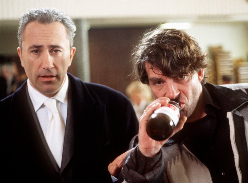 Für Rechtsanwalt Jürgen Strohmeier (Robert Giggenbach, li) und Karl Lagerhoff (Michael Schütz, re), Ehemann der Ermordeten, besteht kein Zweifel an der Schuld des verdächtigen Häftlings.