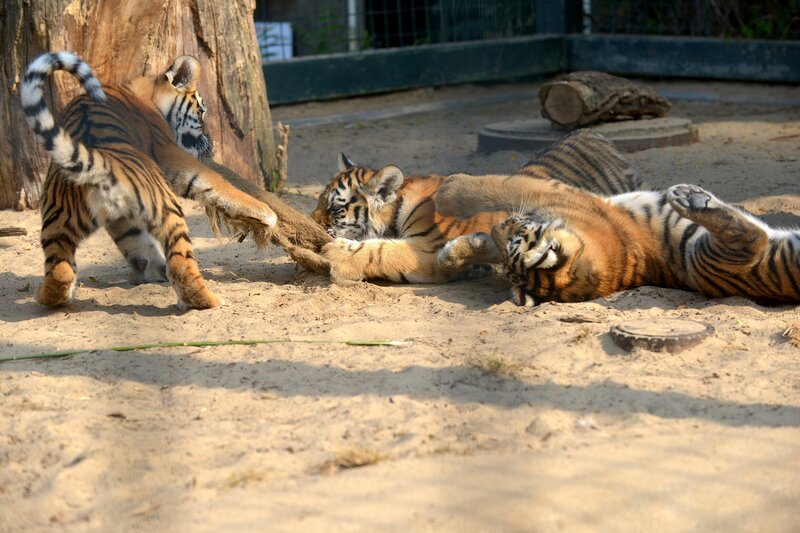 Im Alfred-Brehm-Haus des Berliner Tierparks herrscht noch Mittagsruhe im Revier der sibirischen Tiger. Das wird sich sehr bald ändern, denn hinter den Kulissen bereiten die Tierpflegerinnen Angelika Berkling und Petra Schröder eine Überraschung vor: Jutesäcke mit Holzwolle-Füllung. Während Tigervater Darius sich dem neuen Spielzeug eher vorsichtig nähert, gibt es nebenan kein Halten mehr. Die Tigervierlinge zeigen mit der Holzwolle, was eine sechzehnköpfige Rasselbande so alles drauf hat. - Tigernachwusch spielt mit Jutesack.