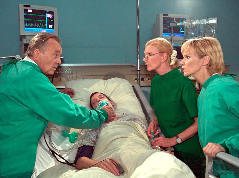 Fabian Althaus (Daniel Krauss, liegend) wurde erneut mit einer Überdosis Heroin in die Klinik eingeliefert. Prof. Simoni (Dieter Bellmann, links), Dr. Kathrin Globisch (Andrea Kathrin Loewig, rechts) und Oberschwester Ingrid (Jutta Kammann) bangen um sein Leben.