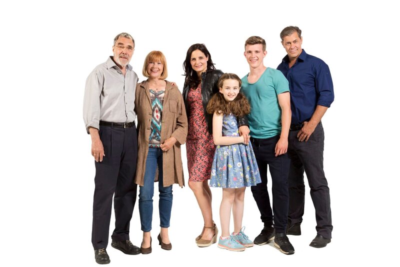 Die Familie v.l.n.r. Prof. Georg Baumgart (Gunter Schoß), Charlotte Baumgart (Ursela Monn), Dr. Susanne Mertens (Elisabeth Lanz), Luisa Mertens (Deborah Mary Schneidermann), Jonas Mertens (Lennart Betzgen), Dr. Christoph Lentz (Sven Martinek).