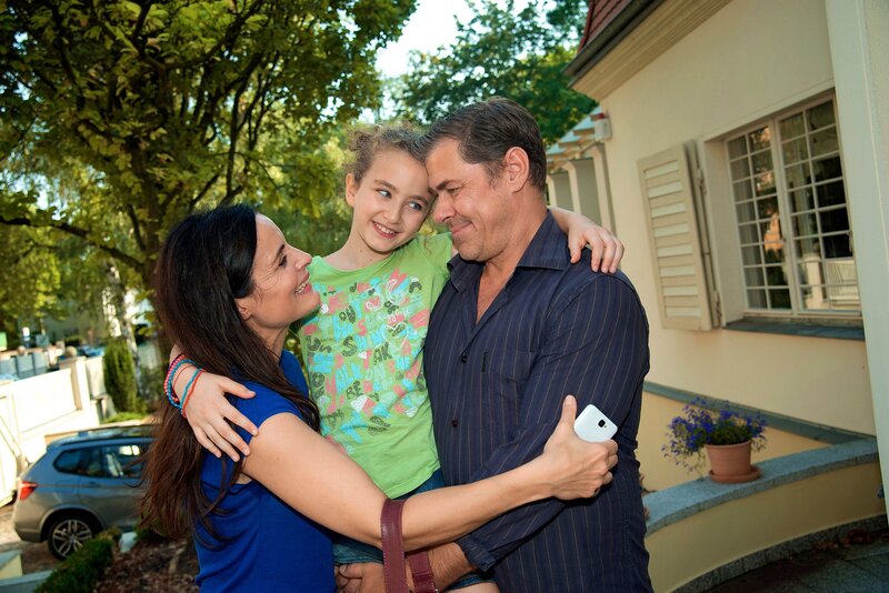Dr. Christoph Lenz (Sven Martinek, r.) kehrt nach 6 Monaten von einer Forschungsreise aus Brasilien zurück zu Dr. Susanne Mertens (Elisabeth Lanz, l.) und der gemeinsamen Pflegetochter Luisa Baltrusch (Deborah Mary Schneidermann, M.).