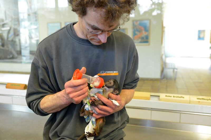 Die kleine Dianameerkatze aus dem Berliner Tierpark ist ein Flaschenkind und braucht eine Rund-um-die-Uhr-Betreuung. Die Nächte verbringt das Affenbaby darum bei den Tierpflegern zu Hause.