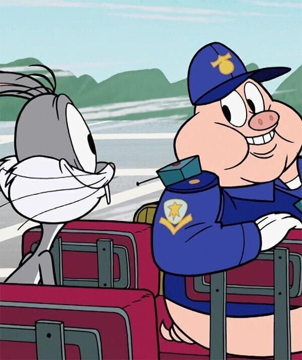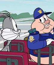 Bugs ist zu spät für seinen Flug und trifft am Flughafen permanent auf Schweinchen Dick.