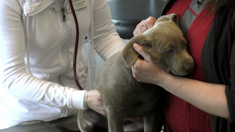 Der neun Wochen alte Labrador-Welpe Honey ist zum Erstcheck in der Tierklinik und erobert im Sturm die Herzen aller Angestellten.
