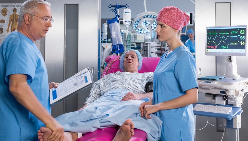 Dr. Loosen diagnostiziert eine Durchblutungssörung bei Herrn Jakobi.V.l.n.r. Dr. Harald Loosen (Robert Giggenbach), Alexander Jakobi (Mike Maas), Julia Berger (Mirka Pigulla).
