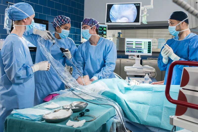 Vivi übernimmt die OP an Lilly Merz, in der sie einen verschluckten Zahnstocher herausoperiert. V.l.n.r. Komparsin, Vivienne Kling (Jane Chirwa), Lilly Merz (Marthe L. Deutschmann, liegend), Ben Ahlbeck (Philipp Danne), Dr. Matteo Moreau (Mike Adler).