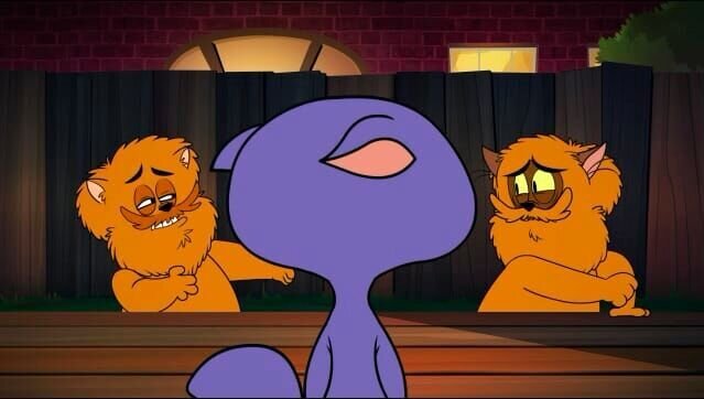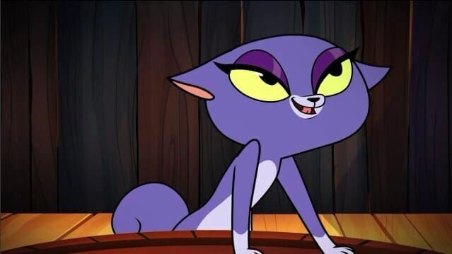 First and second from the left: Patches the Weredude (voiced by Eric Bauza), Elvira (voiced by Kari Wahlgren)