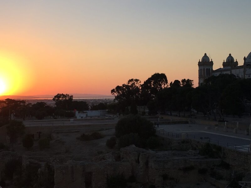 Sonnenuntergang mit Blick auf den Byrsa-Hügel. Byrsa kommt aus dem Griechischen und heißt Tierhaut und bezieht sich auf die Gründungslegende Karthagos.