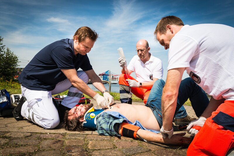 Dr. Haase (Fabian Harloff, l.) versorgt den LKW-Fahrer Thorsten Sudmann (Isaak Dentler, liegend), der auf der Flucht vor Tarik absichtlich von einem Wagen angefahren wurde.