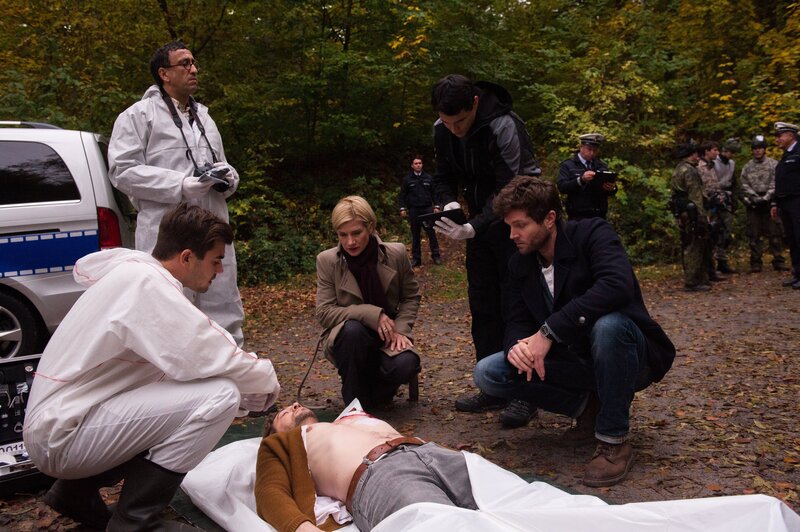• Das Team der SOKO Stuttgart mit Martina Seiffert (Astrid M. Fünderich, M.), Jo Stoll (Peter Ketnath, r.), Rico Sander (Benjamin Strecker, 2.v.r.), Jan Arnaud (Mike Zaka Sommerfeldt, 2.v.l.) und Benedikt Förster (Florian Wünsche, l.) haben noch keine Erklärung dafür, wie die Leiche von Marc Roeders (Leander Lichti, liegend) in den Wald gekommen ist. Vor wenigen Wochen war Roeder schon einmal Opfer eines Überfalls geworden.