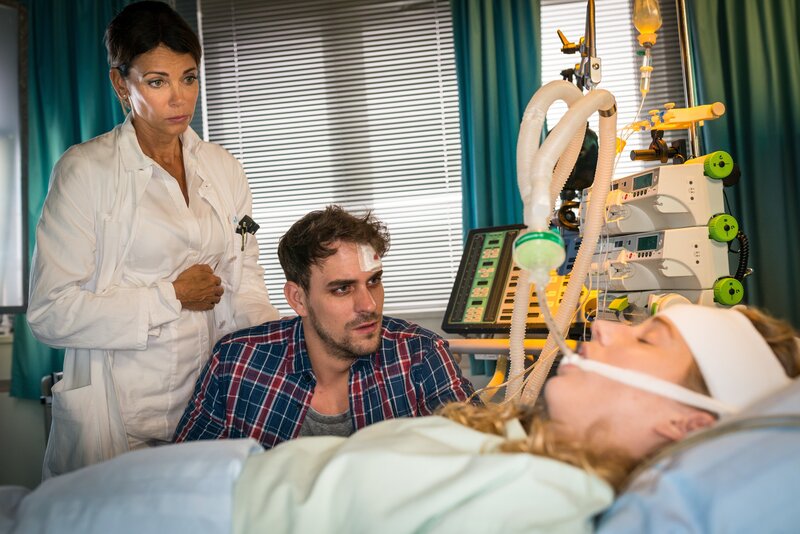 Nachdem er Mattes (Matthias Schloo, r.) kurzzeitig außer Gefecht setzen konnte, klaut Jannik (Louis Nitsche, l.) das Dienstfahrzeug der Polizisten.