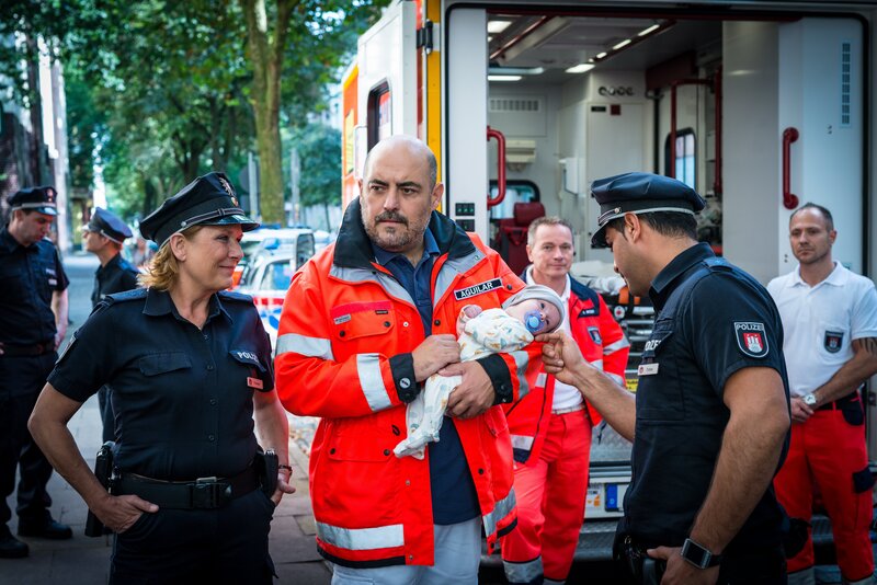 Claudia (Janette Rauch, l.) und Tarik (Serhat Cokgezen, r.) sind froh, dass dem Säugling nichts geschehen ist und übergeben ihn Dr. Aguilar (Gabriel Munoz Munoz, M.).