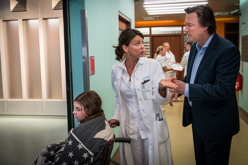 Jasmin (Gerit Kling, M.) lässt sich von Eugen Eschenbachs (Martin Armknecht, r.) Unbeherrschtheit nicht beeindrucken und kümmert sich um dessen Tochter Birte (Runa Greiner, l.).