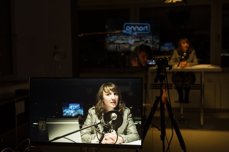 Die Moderatorin Hanna Lohr (Johanna Falckner) bei ihrer allnächtlichen Sendung.