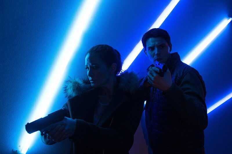 • Selma Kirsch (Yve Burbach) und Rico Sander (Benjamin Strecker) müssen einen Mord verhindern und fühlen sich im abgedunkelten Studio wie in einem Labyrinth.