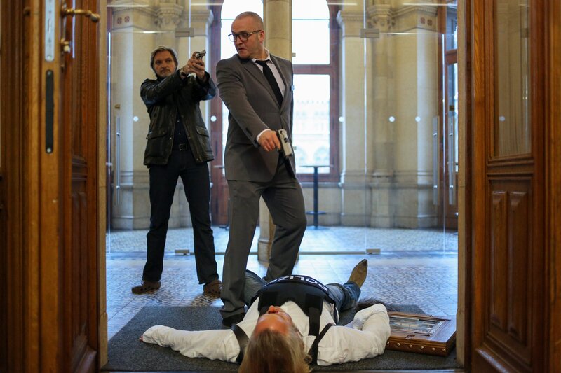 Kann Major Carl Ribarski (Stefan Jürgens, l.) das Leben seines Kollegen Oberstleutnant Helmuth Nowak (Gregor Seberg, liegend) retten oder wird Johann Most (Rainer Haustein, M.) Nowak kaltblütig erschießen?