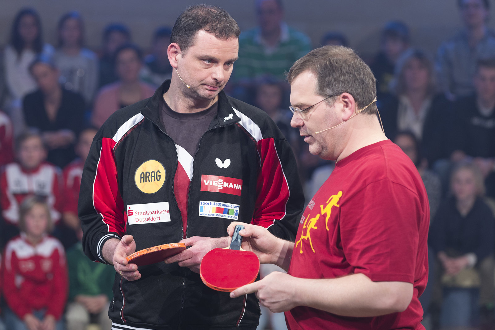 Ganz schön sportlich!Elton möchte wissen, wie man so einen Tischtennisschläger eigentlich korrekt hält.Bild: © ZDF/Ralf Wilschewski