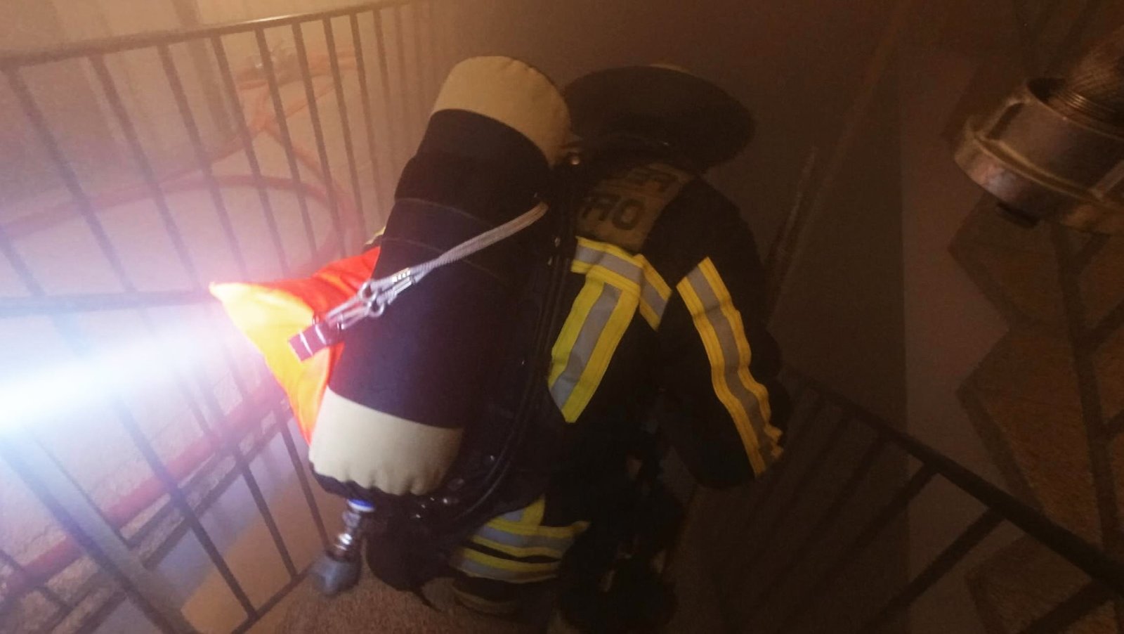 Einsatz im MehrfamilienhausEin Feuerwehrmann der Berufsfeuerwehr Offenbach im Einsatz.Bild: © HR