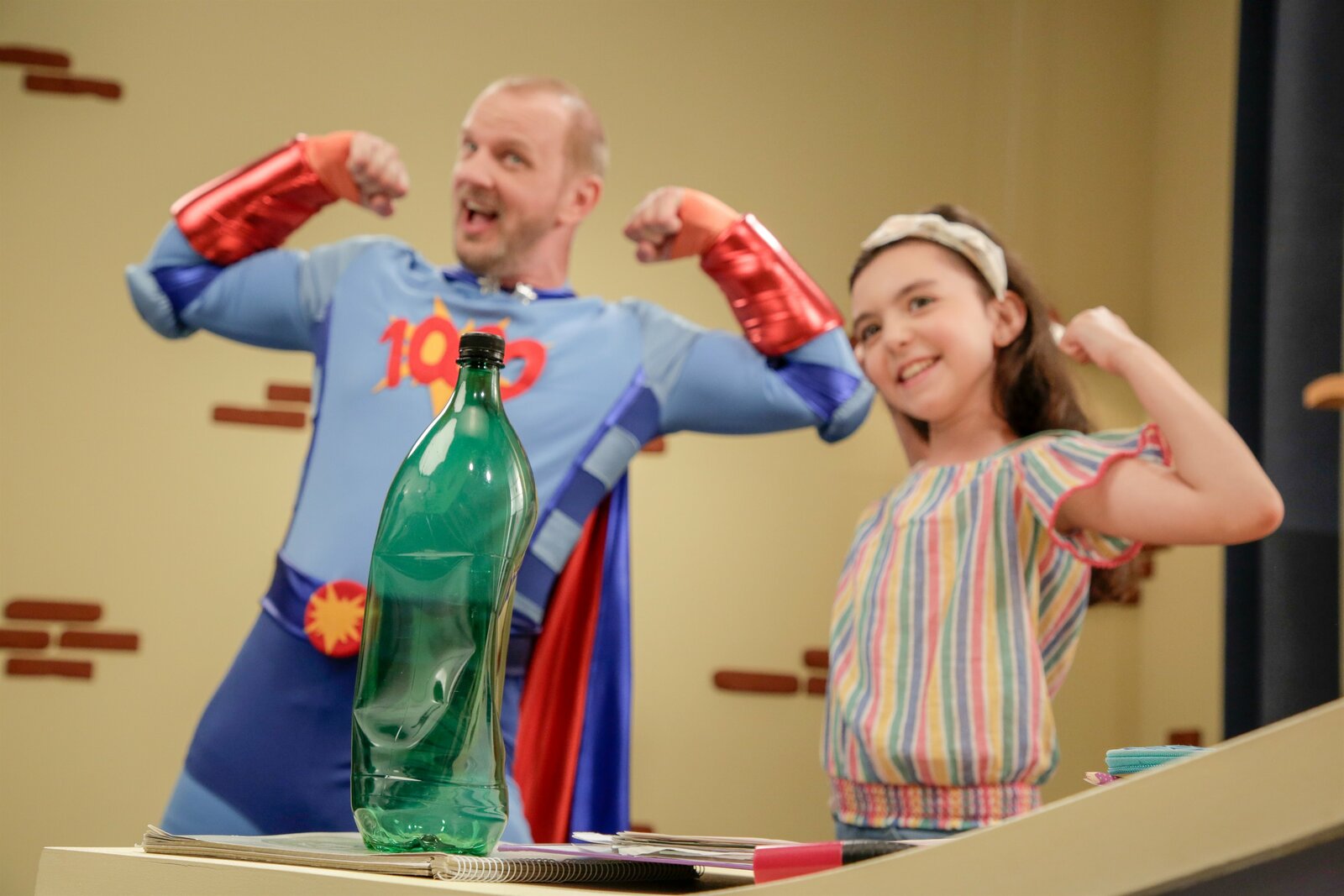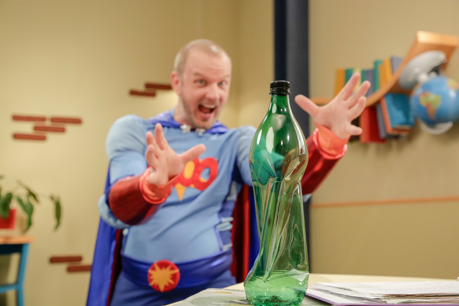 Der BüchertrickMagic Max zeigt, wie er mit der Kraft seiner Gedanken eine Flasche zerdrücken kann.Bild: © ZDF/Günther Pichlkostner