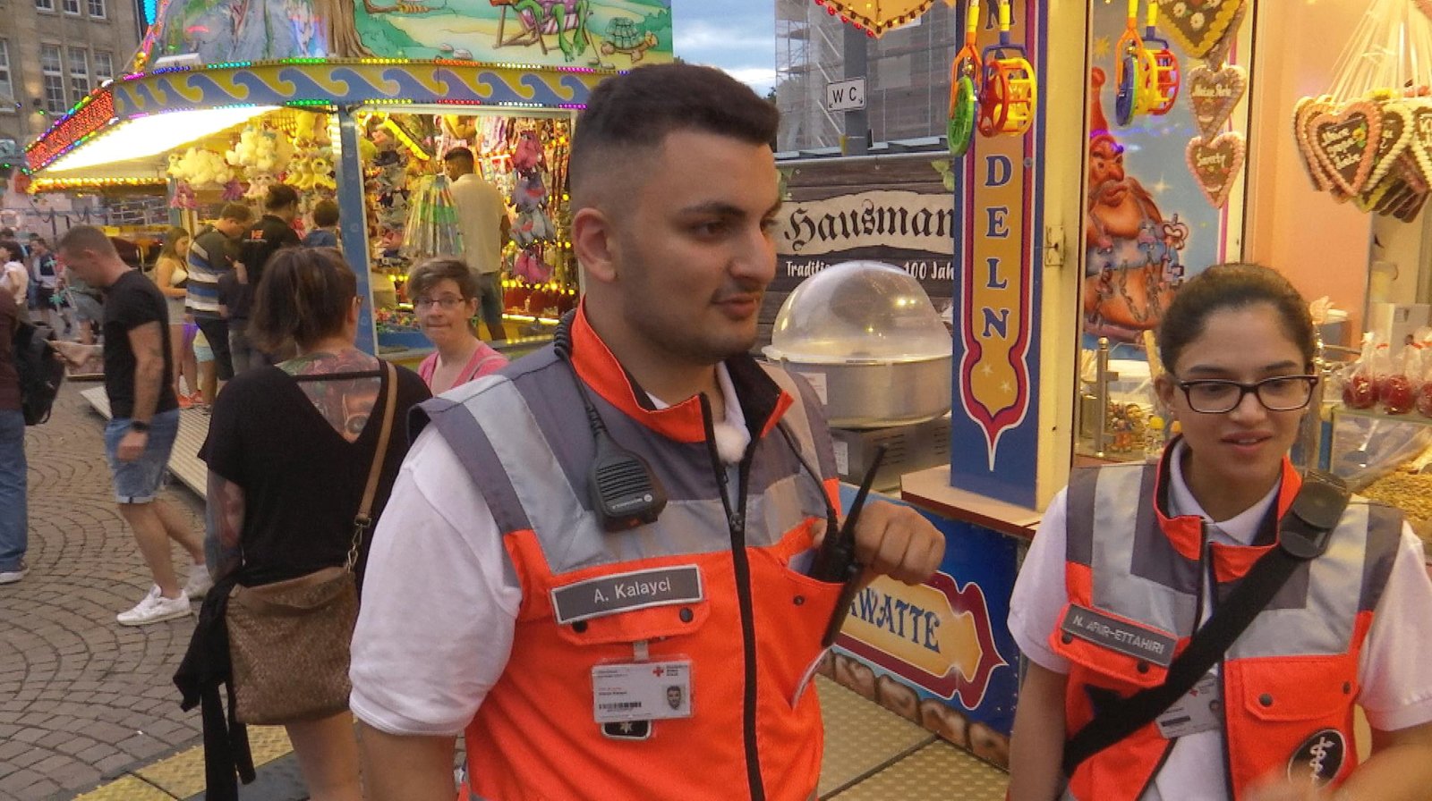 Folge 3Der Notfallsanitäter Ahmet Kalayci vom Deutschen Roten Kreuz – hier mit einer Kollegin – arbeitet ehrenamtlich auf dem Heinerfest Darmstadt.Bild: © HR