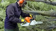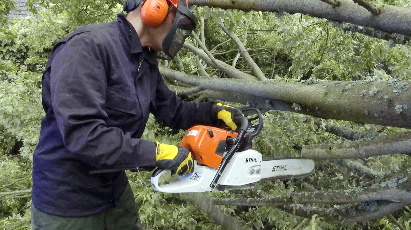Folge 2Ein Darmstädter Feuerwehrmann zersägt einen umgestürzten Baum.Bild: © HR
