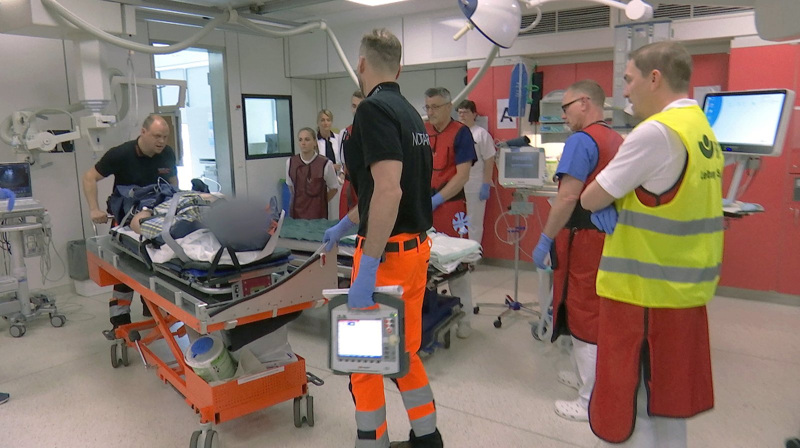Folge 5Schwerer Verkehrsunfall: Dr. Martin Simon Heinz (rechts) und sein Team im Schockraum der BGU Frankfurt kümmern sich um einen verletzten Patienten.Bild: © HR