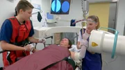 Krampfanfall am FrühstückstischKrankenschwester Clara Henneberger (links) und die Ärztin Dr. Stephanie Köhler (rechts) behandeln den gebrochenen Arm ihrer Patientin Sylvia Treusch.Bild: © HR