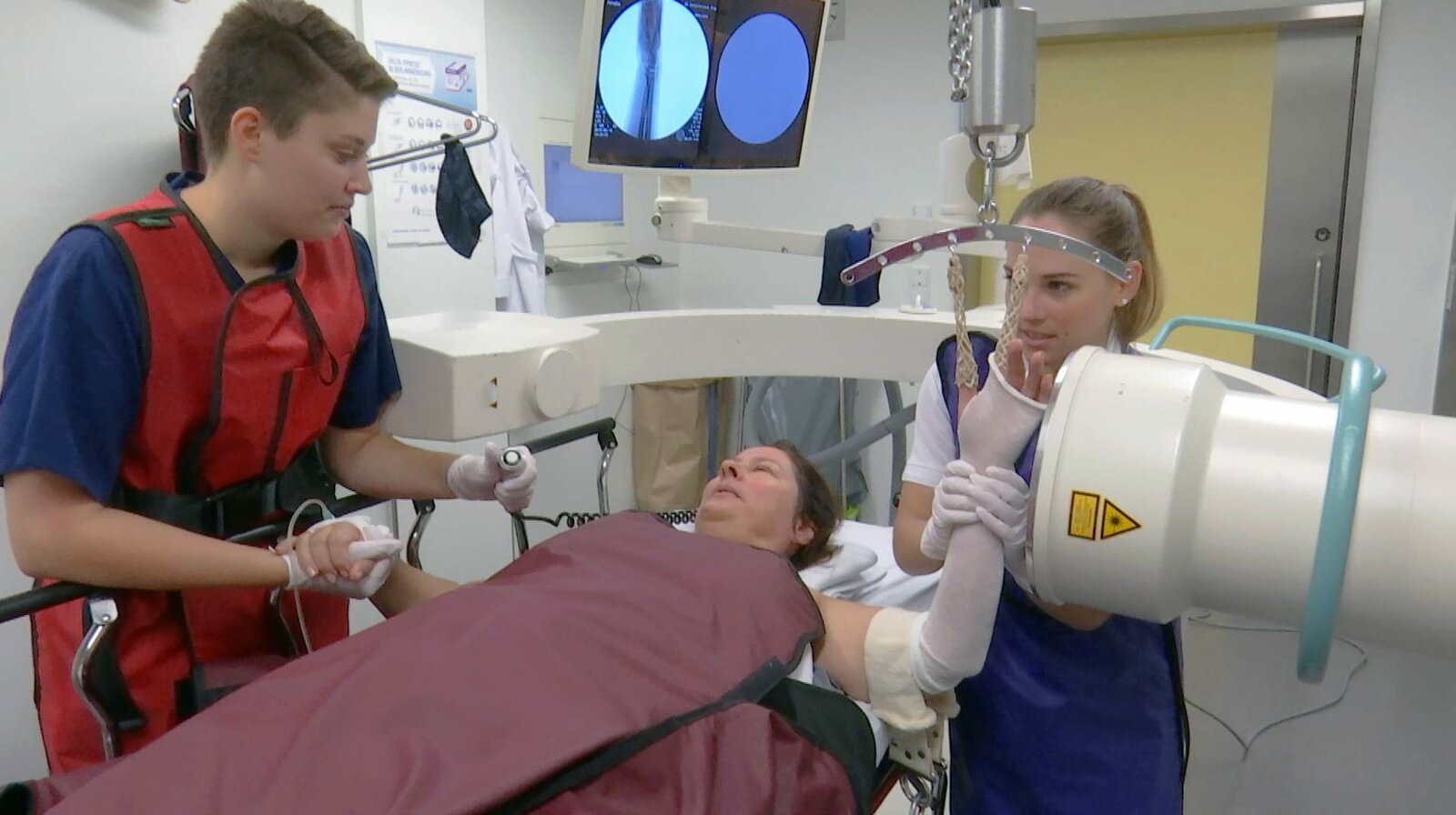 Folge 2Die Krankenschwester Clara Henneberger (links) und die Ärztin Stephanie Köhler von der BG Unfallklinik Frankfurt versorgen den komplizierten Armbruch einer Patientin.Bild: © HR
