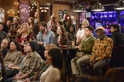 Eine wilde CollegenachtOleg (Jonathan Kite, r.) möchte unbedingt eine bessere Beziehung zu seiner Tochter aufbauen, während Sophie (Jennifer Coolidge, l.) Barbara nur für sich haben will. Unterdessen erhalten Caroline (Beth Behrs, 2.v.l.) und Max (Kat Dennings, 2.v.r.) eine vielversprechende Einladung ...Bild: © Warner Bros. Television