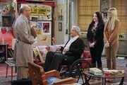 Der MietvertragRoger (Paul Tigue, l.), der Vermieter von Max' (Kat Dennings, 2.v.r.) und Carolines (Beth Behrs, r.) Wohnung will die Pacht verlängern, doch der Vertrag zu einer unschlagbar günstigen Miete läuft nicht auf deren Namen, sondern auf den in die Jahre gekommenen Vorbesitzer Lester (Hal Linden, 2.v.l.) ...Bild: © Warner Bros. Television Lizenzbild frei