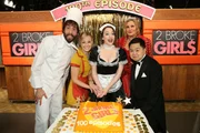 Der perfekte LunchDer Cast feiert die 100. Episode der Serie: Jonathan Kite (l.), Beth Behrs (2.v.l.), Kat Dennings (M.), Jennifer Coolidge (2.v.r.) und Matthew Moy (r.) ...Bild: © Warner Brothers